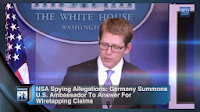 Germany's Foreign Ministry summoned the U.S. ambassador Thursday following allegations that American intelligence may have targeted Chancellor Angela Merkel's cellphone. At the same time, a senior lawmaker expressed concern at the White House's statement that it isn't monitoring and won't monitor Merkel's communications - a response that didn't address what might have happened in the past.